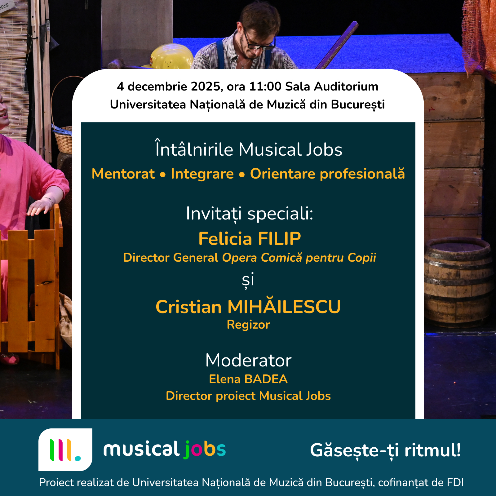 Joi, 4 decembrie 2025, studenții, absolvenții și cadrele didactice ale UNMB sunt invitate să participe la o nouă ediție Musical Jobs, cu tema: Mentorat • Integrare • Orientare profesională.